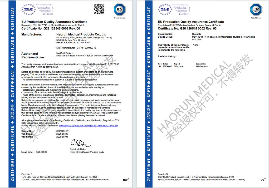 Um die Qualität weiter zu verbessern, haben wir die Veröffentlichung unseres Qualitätshandbuchs und unserer Verfahrensdokumente im September 2023 abgeschlossen. Auf dieser Grundlage haben wir im Januar 2024 unsere Dokumente zum Qualitätsmanagementsystem erweitert und um MDR-bezogene Inhalte hinzugefügt. Am 10. April 2025 haben wir die erste Stufe des TÜV SÜD-Audits bestanden und anschließend die zweite Stufe. Im August dieses Jahres wurde unsere Zertifikatsnummer schließlich zur Einsicht in das System der benannten Stelle verfügbar, was einen neuen Schritt nach vorne im Qualitätsmanagementsystem von Haorun Medical darstellt und die Grundlage für die Entwicklung des Unternehmens stärkt. Unsere medizinischen Einweg-Verbrauchsmaterialien (Mull, Mullrollen, Mullbinden usw.) bieten Kunden weltweit höchste Produktqualität und Service.